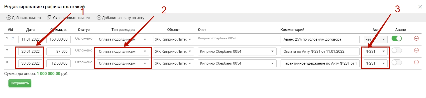 Заполните поля даты платетежей (1) и статью затрат (2), номер акта заполнится автоматически (3), нажмите "Сохранить"