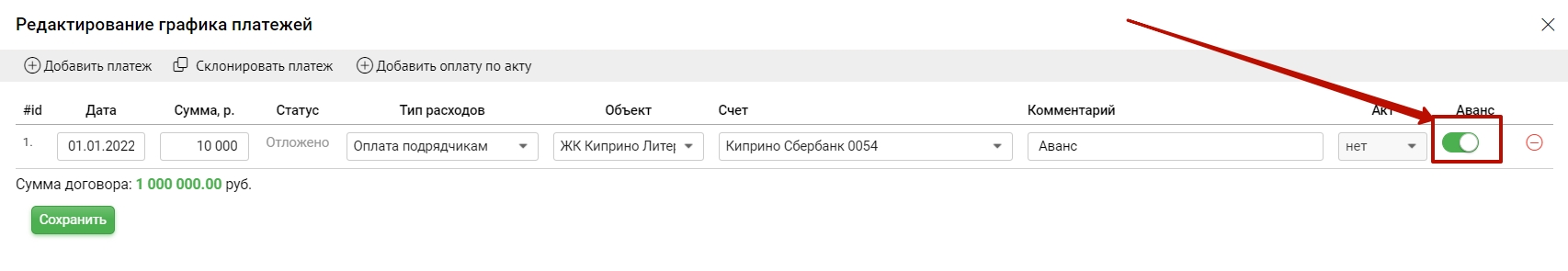 1. При создании авансовых платежей в Графике платежей обязательно укажите метку "Аванс"