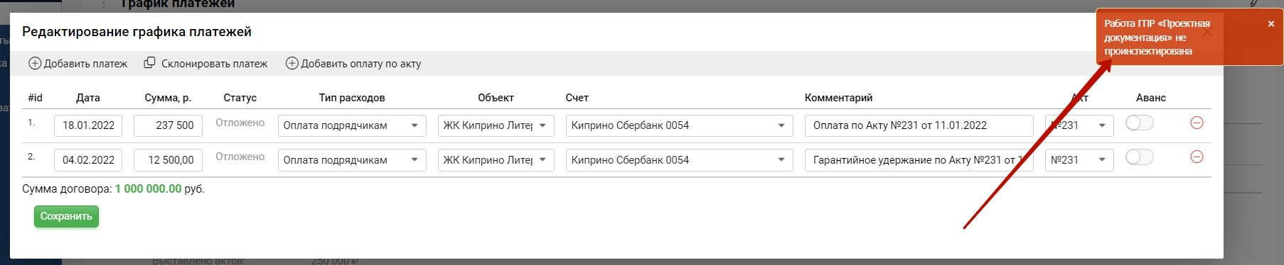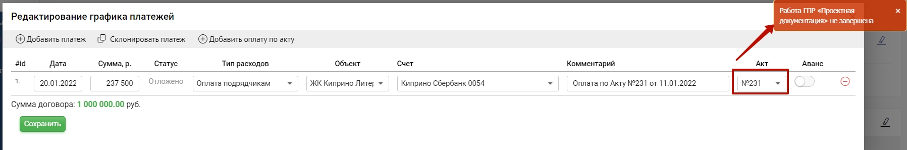 3. Если работа ГПР, к которой привязаны позиции акта**, не завершена** (не имеет статуса "Готово") - при попытке сохранения система выдаст ошибку с наименованием работы ГПР и ее статусом: