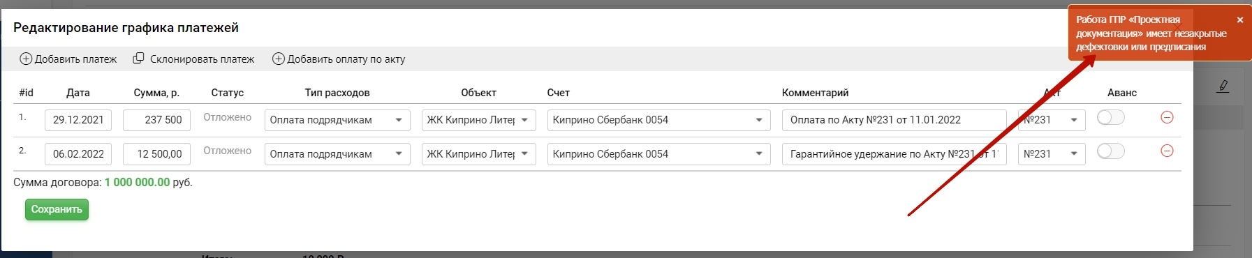 При проверке наличия незавершенной работы ГПР/наличия незакрытых дефектовок система проверяет указанные в акте работы (из предмета договора) и их привязку к работам ГПР. Если у таких работ ГПР имеются неустраненные дефектовки, или работы не завершены - система не позволит создать финансовую операцию на акт.