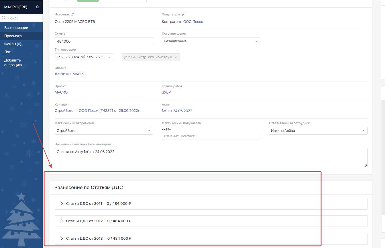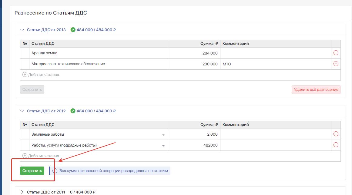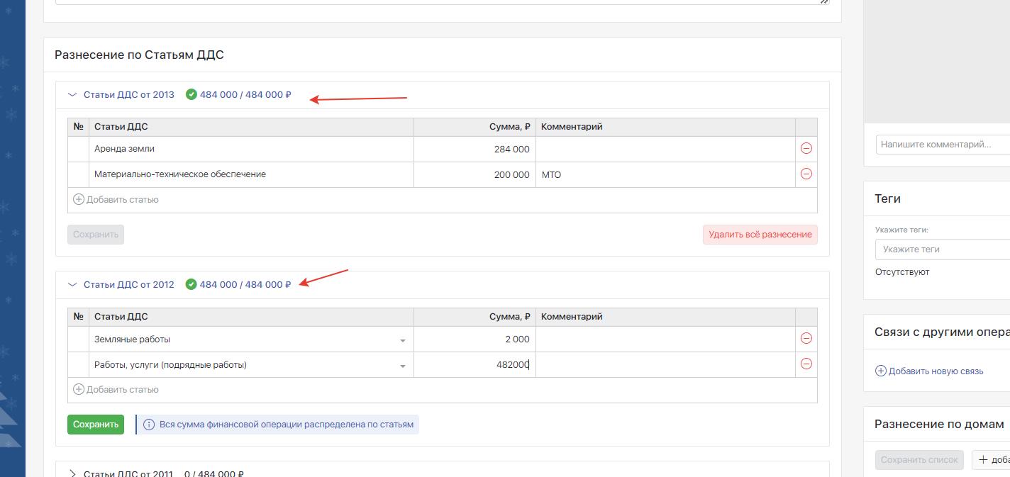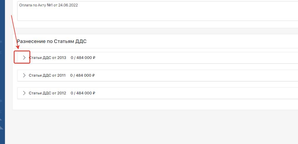 1. Для разнесения финансовой операции (далее ФО) разверните набор статей ДДС, нажав на стрелку