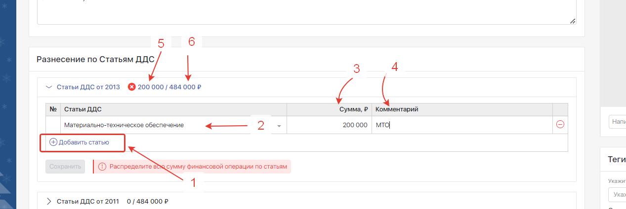 2. Выберите статью ДДС из набора (1), укажите сумму (2), комментарий (3), при необходимости.