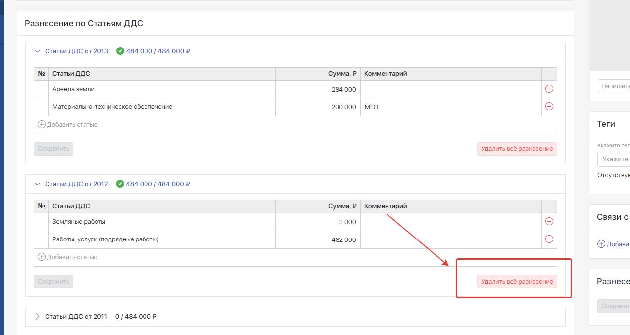 5. Для удаления разнесения по всему набору нажмите "Удалить всё разнесение"