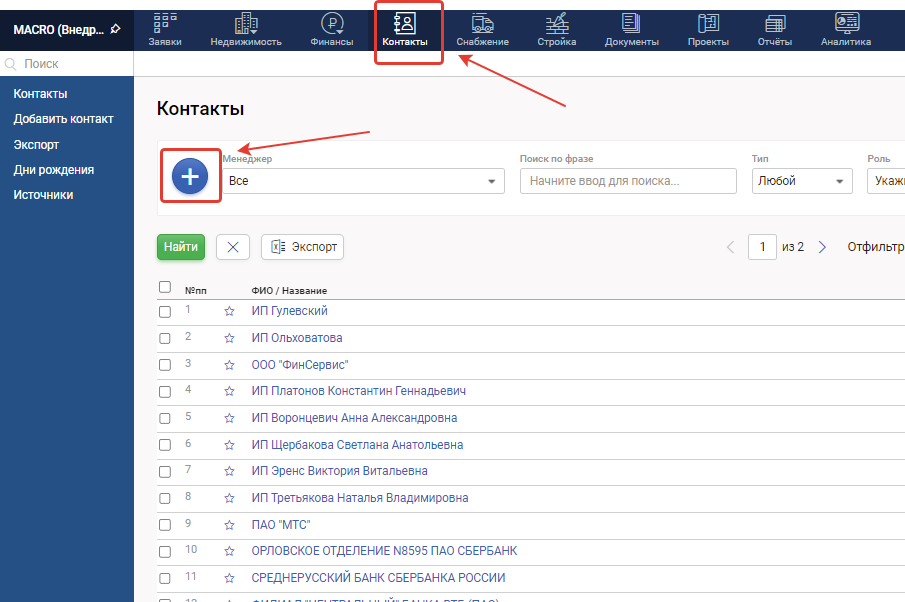 1. Откройте модуль "Контакты" - "Создать новый контакт" (синий плюс)