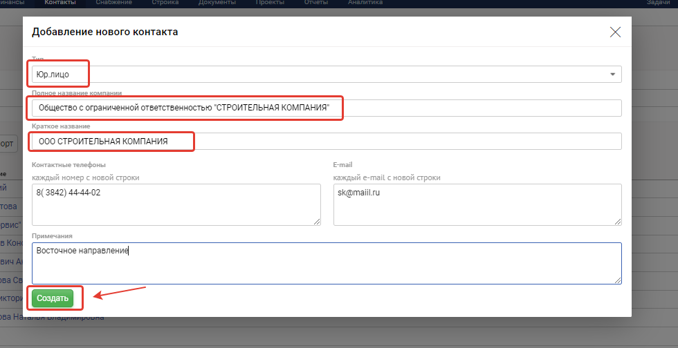 2. В появившемся окне создания контакта заполните: