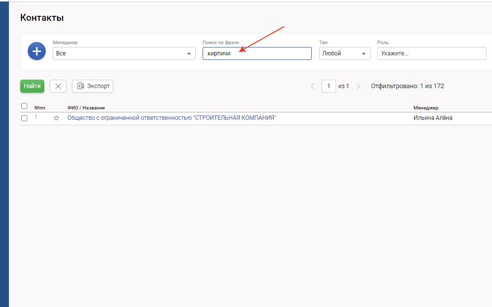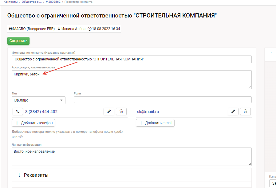 3. В открывшейся карточке контакта при необходимости введите ключевые слова, ассоциации, для удобства поиска контрагента в листинге контактов (поле "Поиск по фразе")