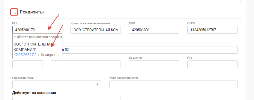 Для заполнения реквизитов нажмите на "стрелку вниз" и в развернувшемся поле введите ИНН, выберите предложенного контрагента и поля "Краткое название компании", "КПП", "ОГРН","Адрес" заполнятся автоматически.