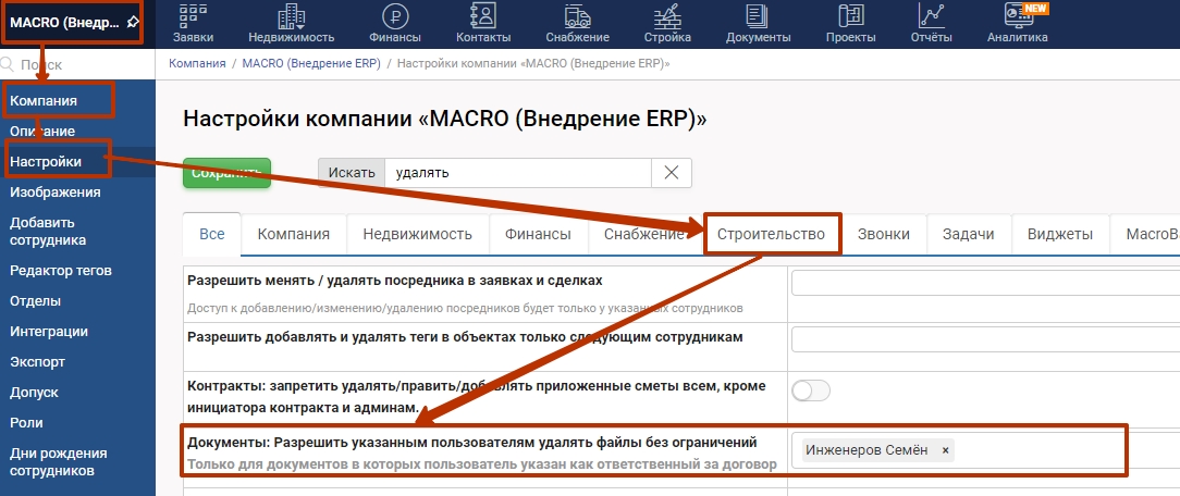 Если необходимо ответственному за договор дать возможность удалять любые вложения на всех этапах договора, необходимо в настройках Компании - Строительство - указать его в настройке "Докмуенты: Разрешить указанным пользователям удалять файлы без ограничений (Только для документов, в которых пользователь указан как ответственный за договор)."