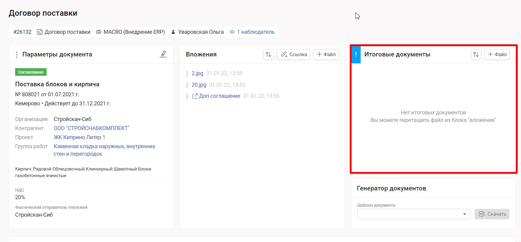 Системой предусмотрено ограничение прав доступа на подгрузку файлов и ссылок в разделе "Вложения", а также в Итоговые документы.