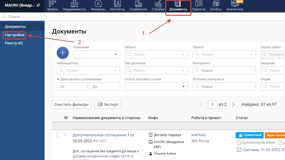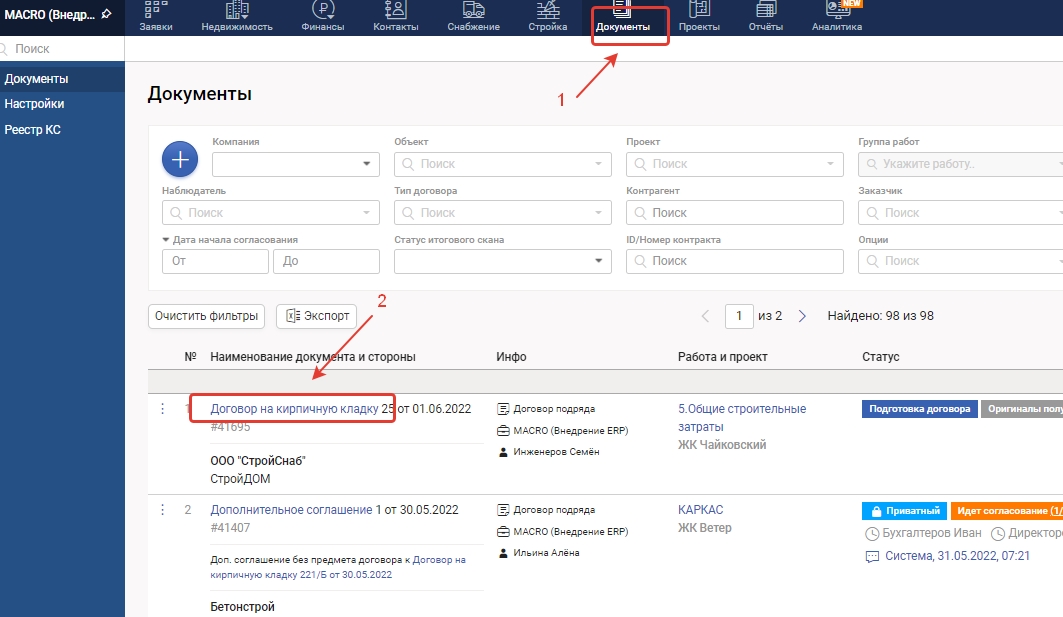 1. Перейдите в модуль Документы, выберите нужный документ, нажав на его название