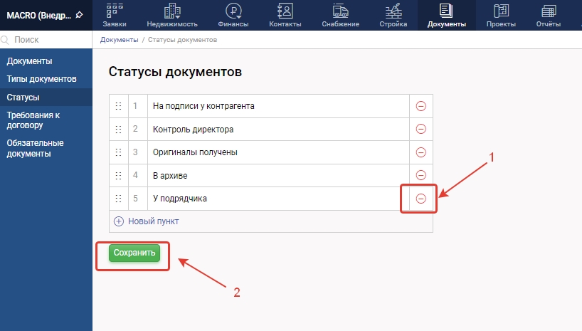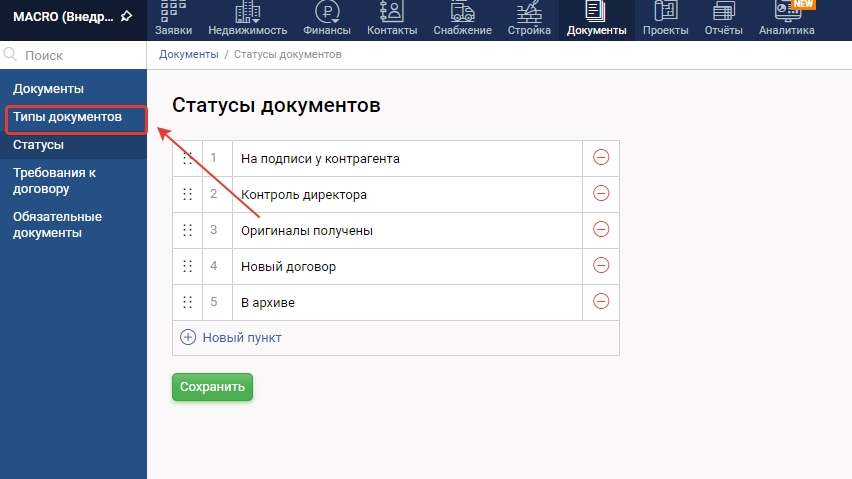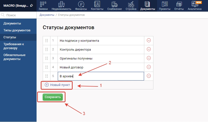 3. Для создания нового статуса нажмите "+Новый пункт", в появившейся строке введите название статуса и нажмите "Сохранить"