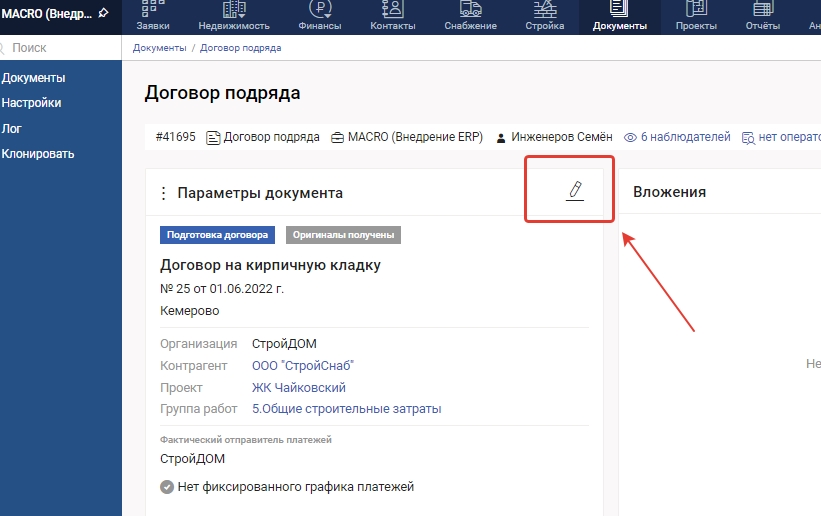 2. В блоке Параметры документа нажмите на "Карандаш"