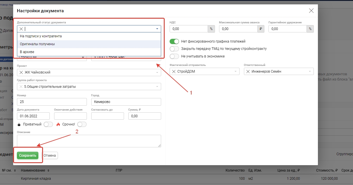 3. В поле Дополнительный статус документа выберите необходимый статус и нажмите "Сохранить"