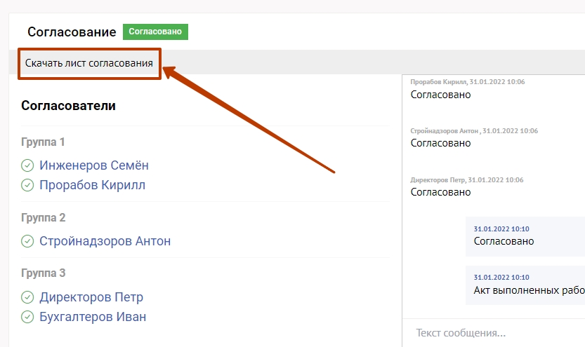 1. Для выгрузки листа в разделе согласования акта нажмите "Скачать лист согласования":