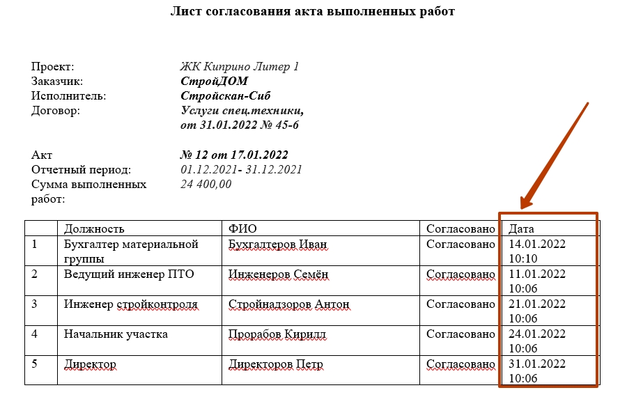 Напротив сотрудника, уже согласовавшего акт, указывается дата и время согласования: