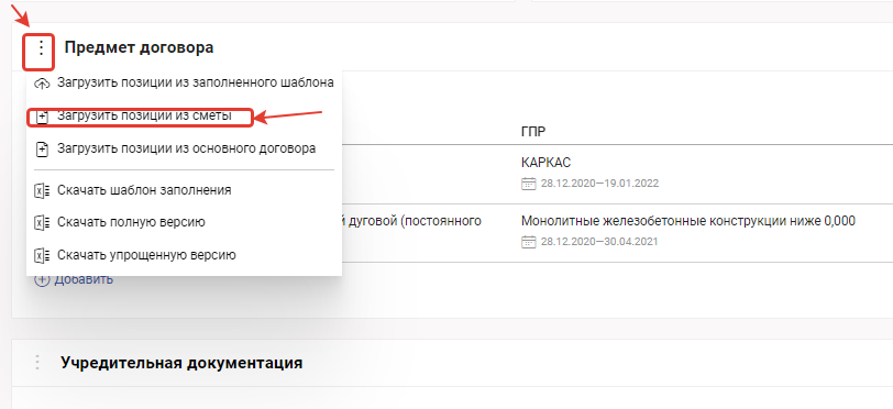 Нажмите на три точки слева от блока "Предмет договора" и выберите пункт - "Загрузить позиции из основного договора".