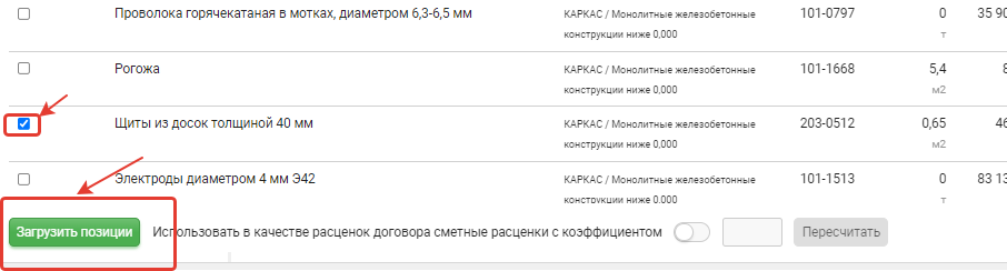 2.2 Выберите смету и нажмите "Загрузить позиции"