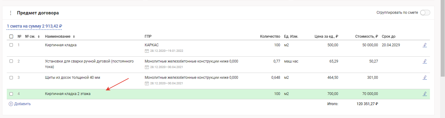 ГПР - выводится группа работ/работа с которой связана позиция в предмете договора