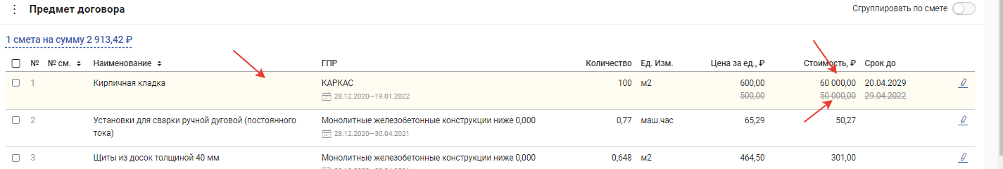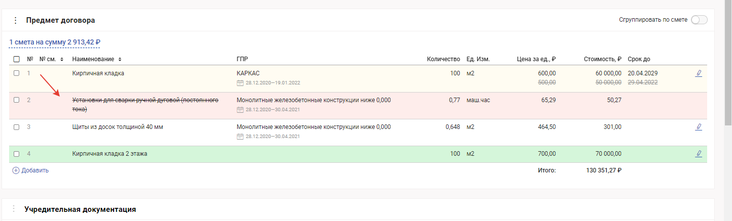 Отредактированные позиции из основного договора подсвечиваются желтым цветом, измененные данные отображаются перечеркнутыми.