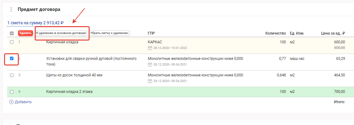 3. Для того чтобы удалить позиции. Выберите их в списке и нажмите кнопку "К удалению в основном договоре"