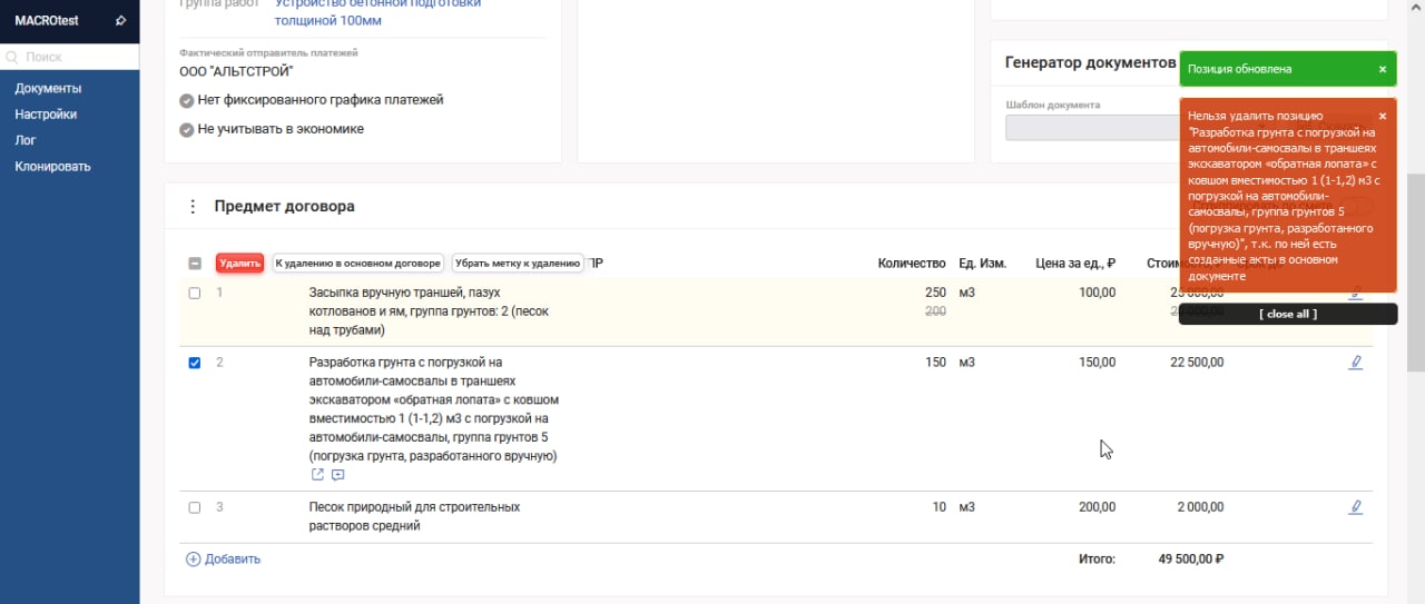 1. Запрещено помечать к удалению позиции из основного документа по которымуже есть созданные акты выполненных работ.