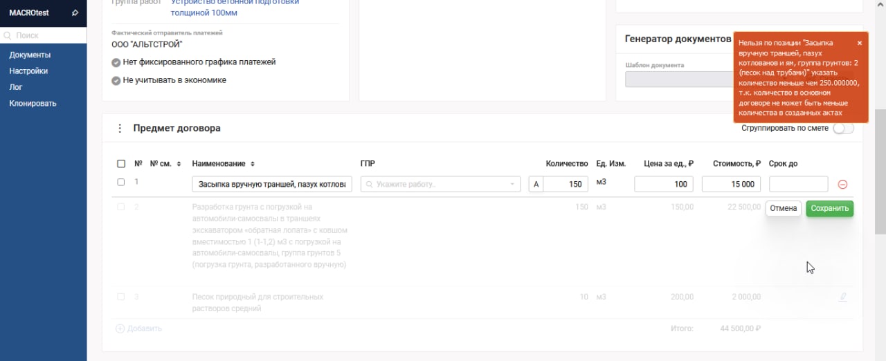 2. Если у позиции есть созданные акты в основном договоре, то в доп.соглашениинельзя указать количество меньше закрытого объема в актах.