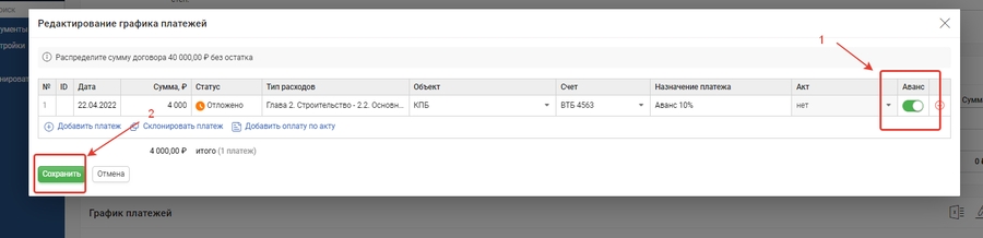 6. Заполните все обязательные поля, включите тумблер "Аванс" и нажмите "Сохранить"