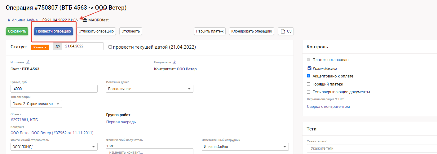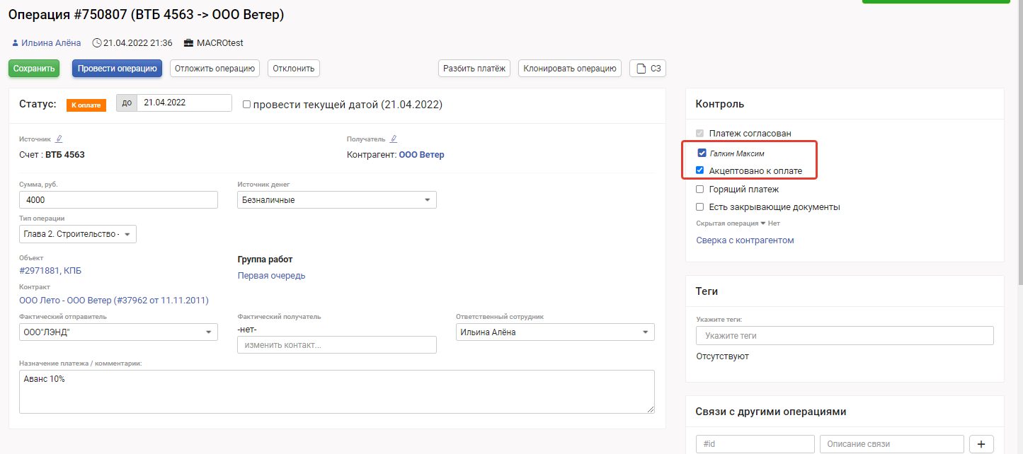 7. При необходимости согласуйте и акцептуйте финансовую операцию.