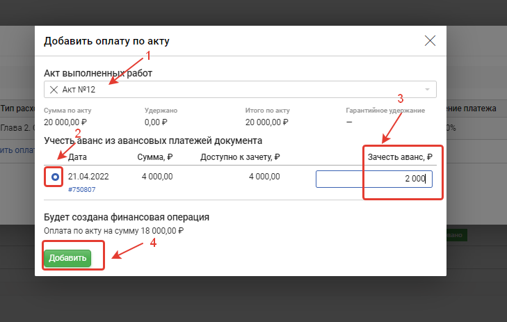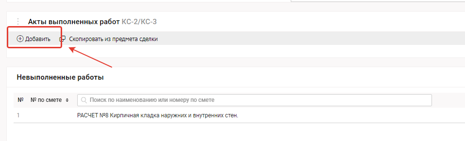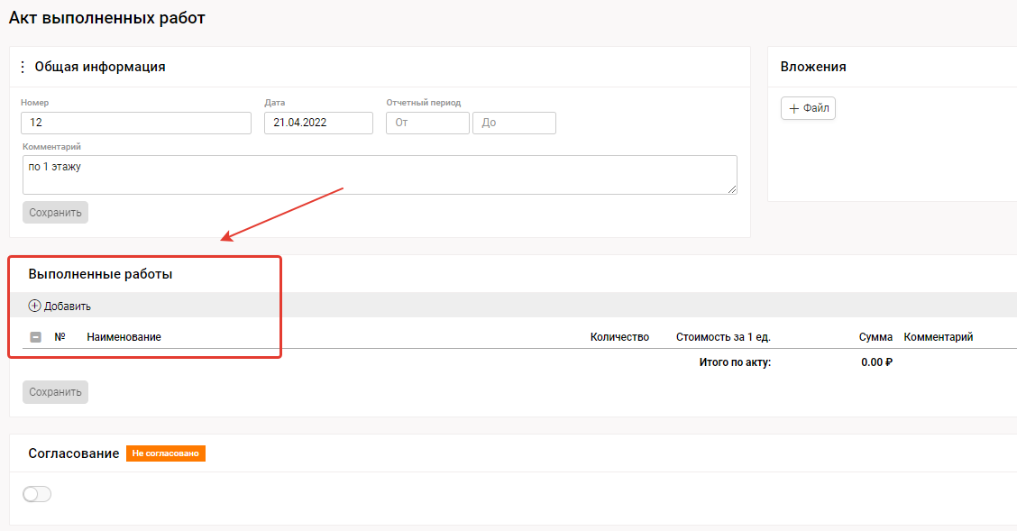 9. Добавьте Акт выполненных работ, нажав на "+Добавить"