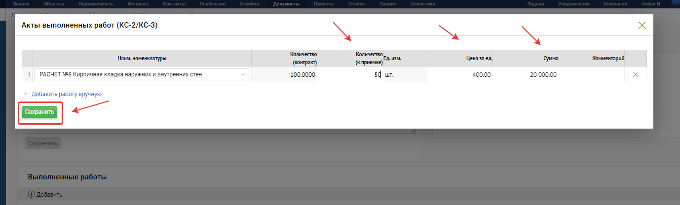 15.При необходимости скорректируйте Количество (к приемке), цену за единицу, сумму. Нажмите "Сохранить"