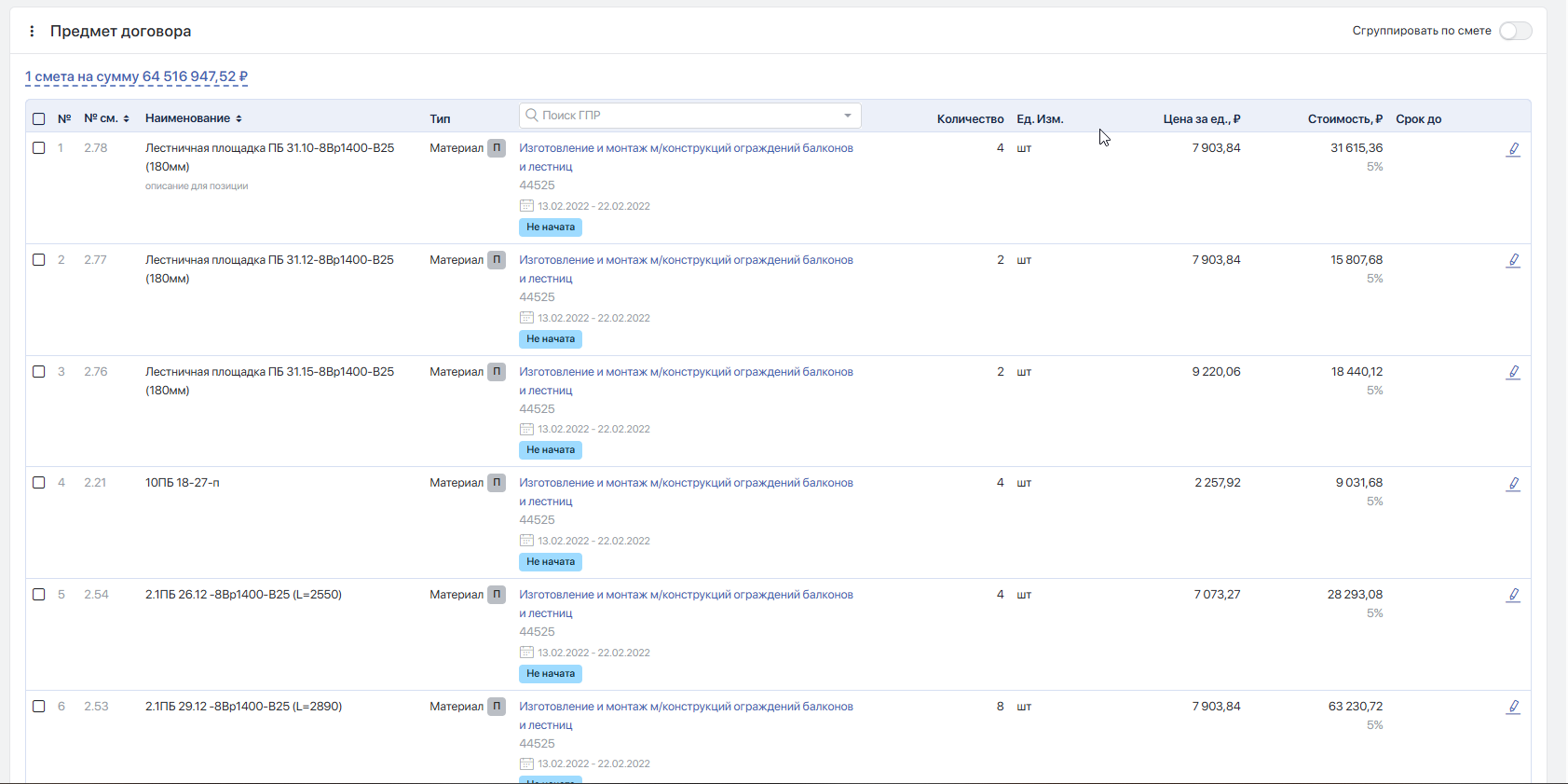 # Заполнение предмета договора из сметы
