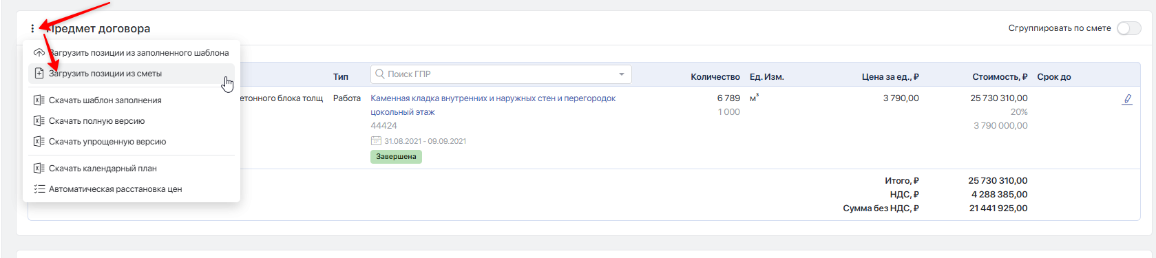 В предмете договора откройте меню «Три точки» и выберите «Загрузить позиции из сметы».