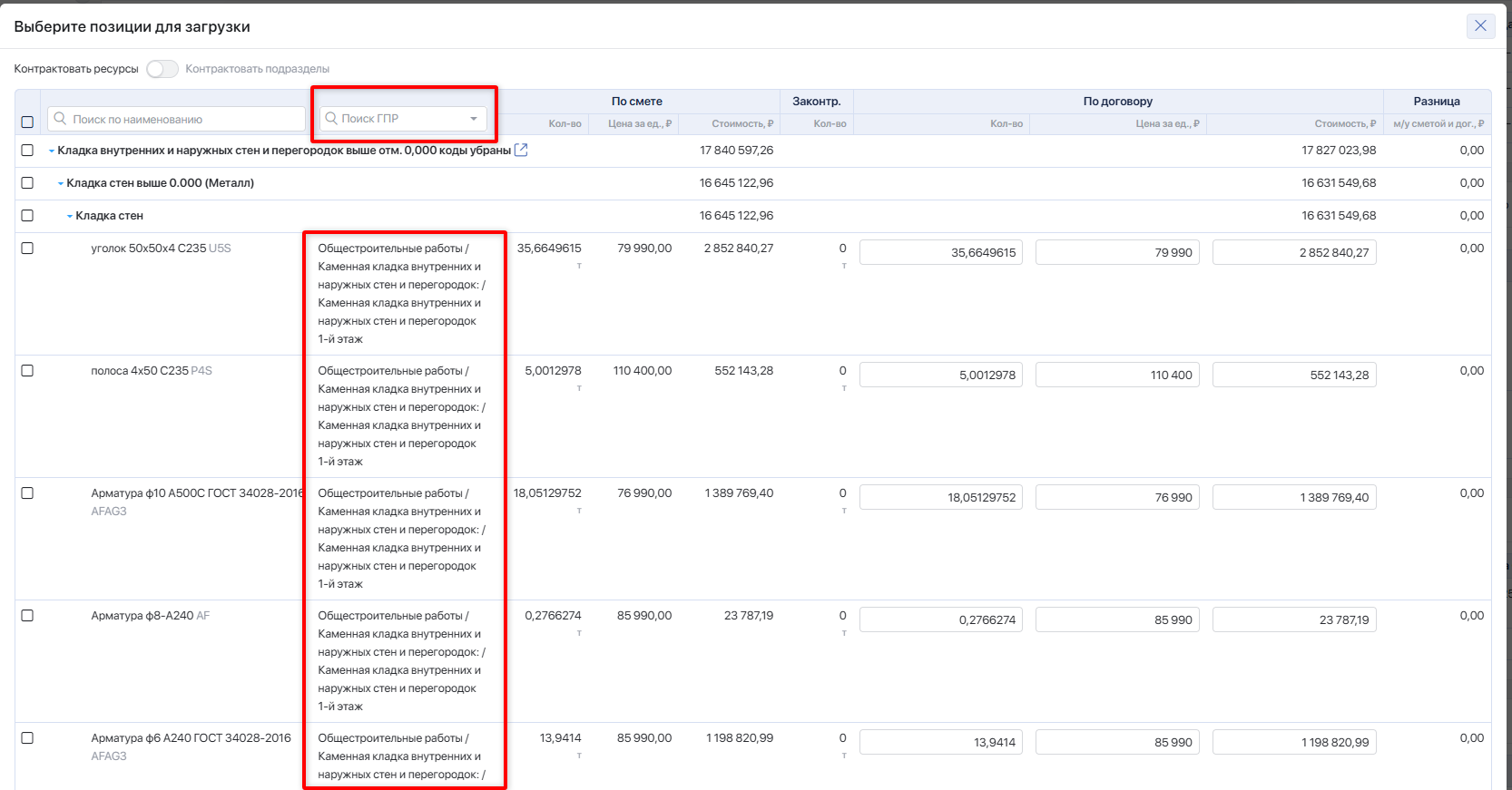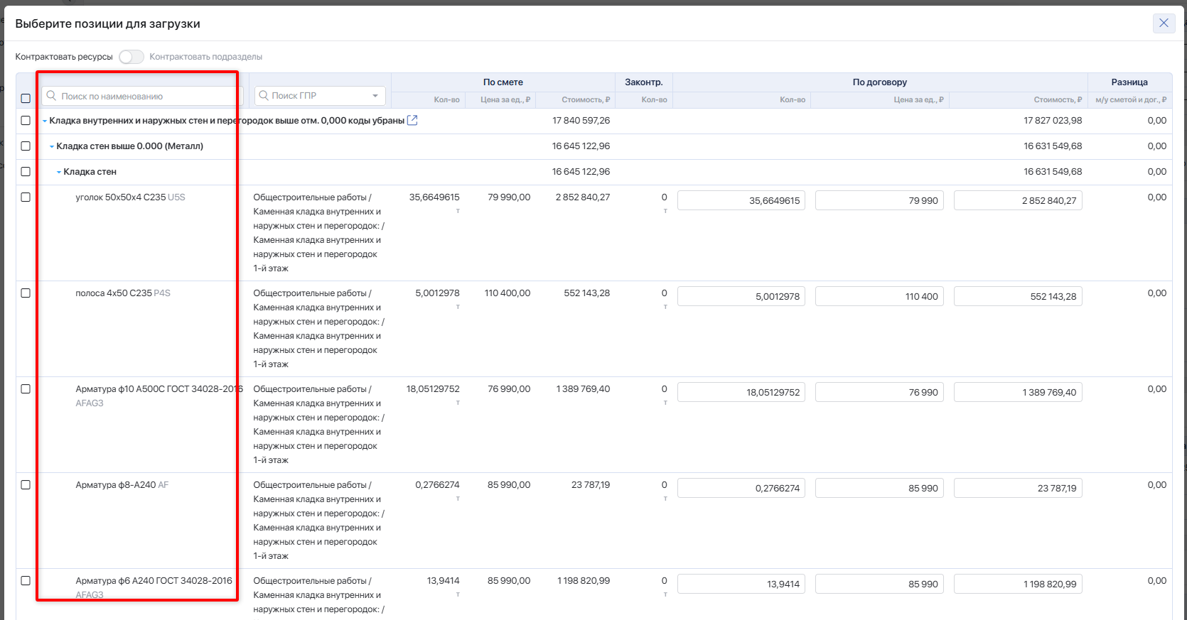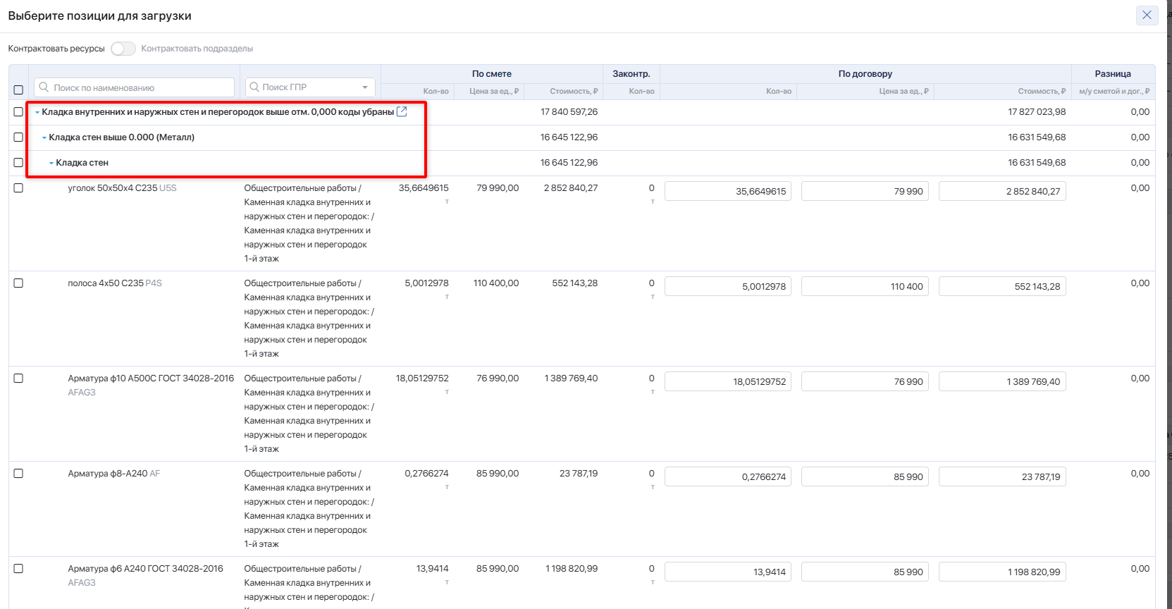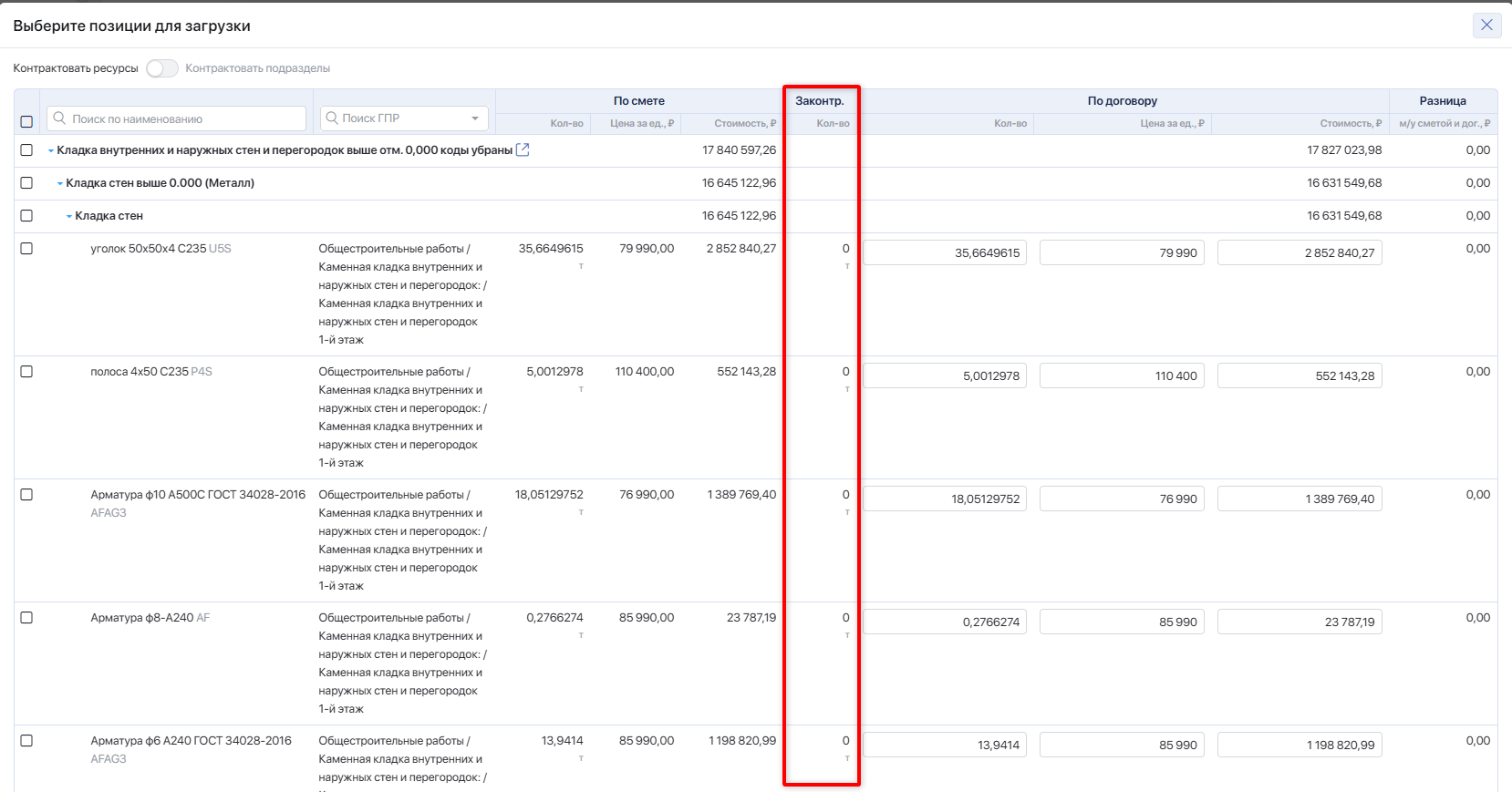 Законтрактовано — количество ресурса из сметы, ранее включённого в договоры (без учёта текущего). Суммируется объём позиции по всем договорам, созданным из этой сметы, по всем контрагентам.