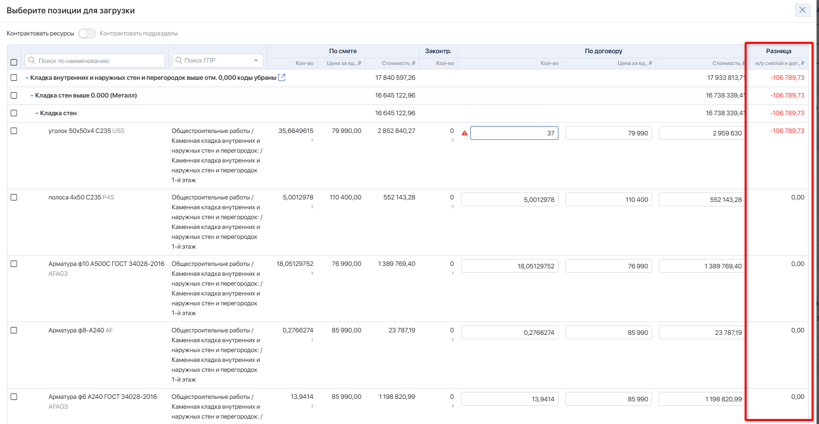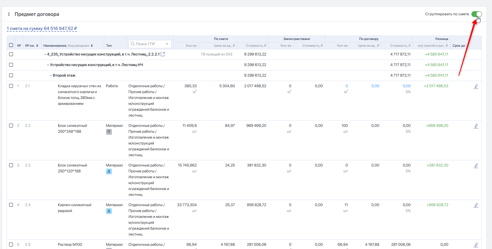 Показатель отображается зелёным, если цена за единицу по договору ниже сметной; красным и со знаком «минус» — если выше сметной.
