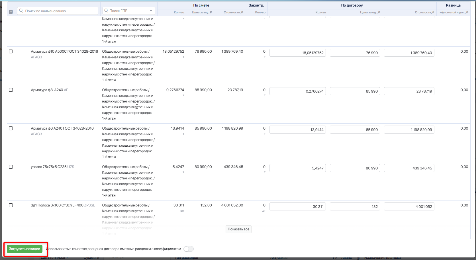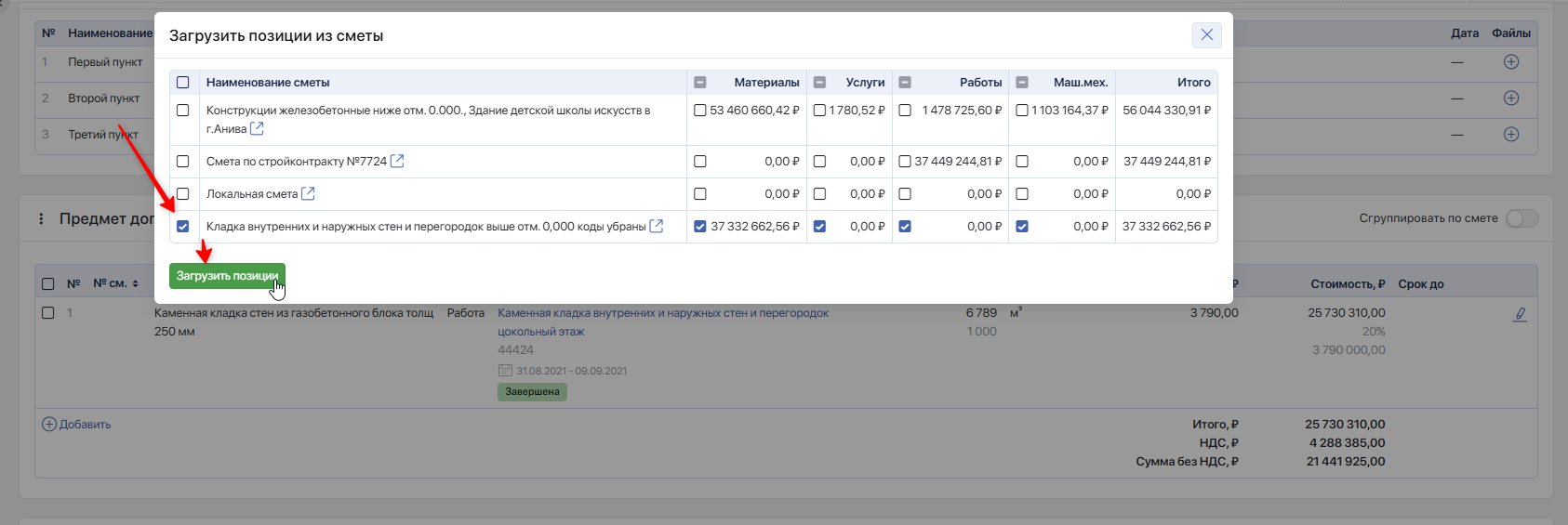 После выбора позиций и корректировки объёмов и стоимости нажмите **`Загрузить позиции`**.