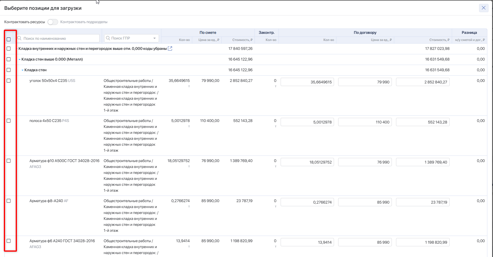 * **Количество** — укажите объём по каждому ресурсу. По умолчанию подставляется остаток из сметы: общее количество по смете минус уже законтрактованный объём.