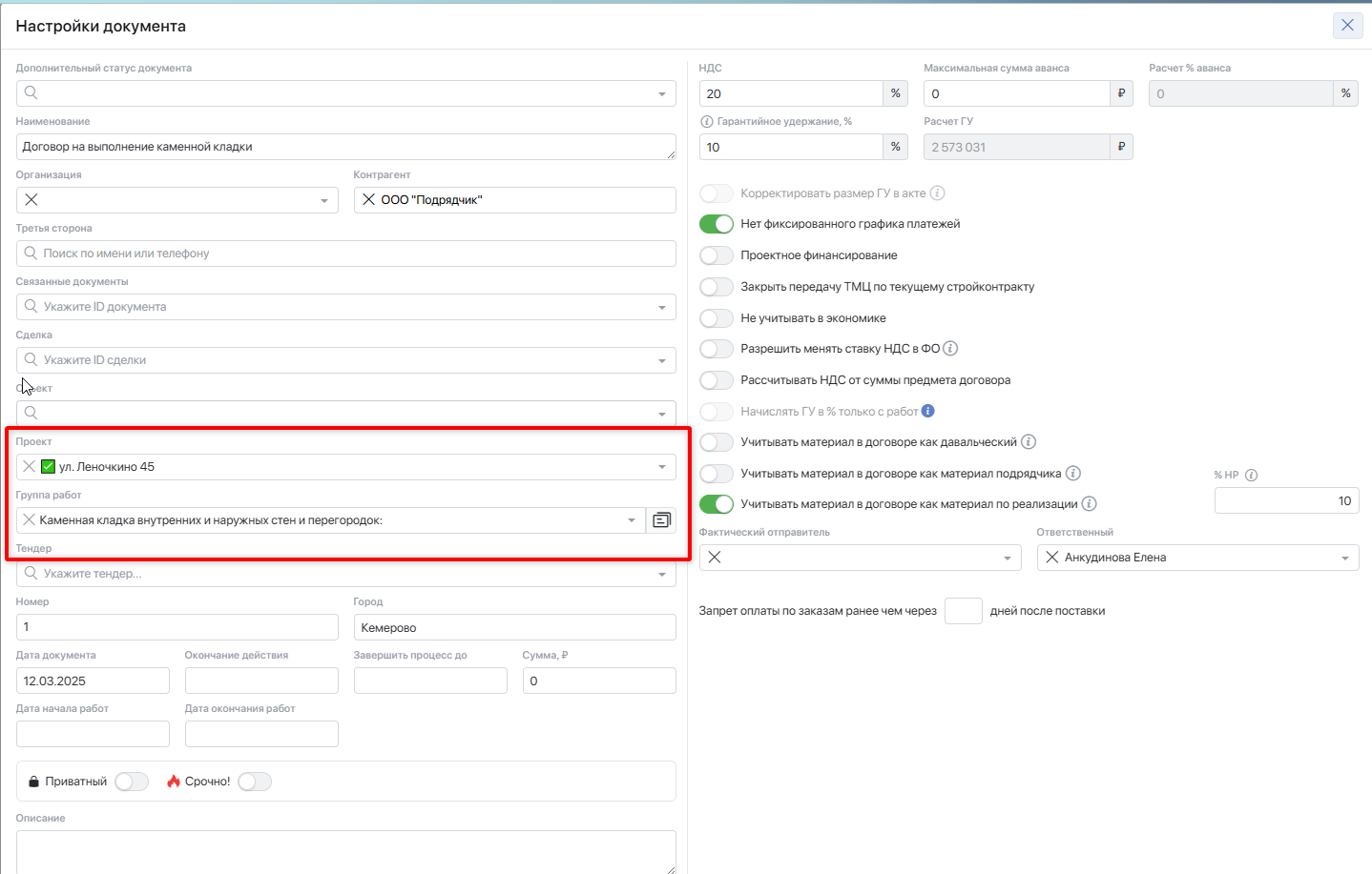 В модуле <mark style="background-color:purple;">**Документы**</mark> создайте «Договор» и заполните основные параметры. Обязательно укажите проект и группу работ проекта.