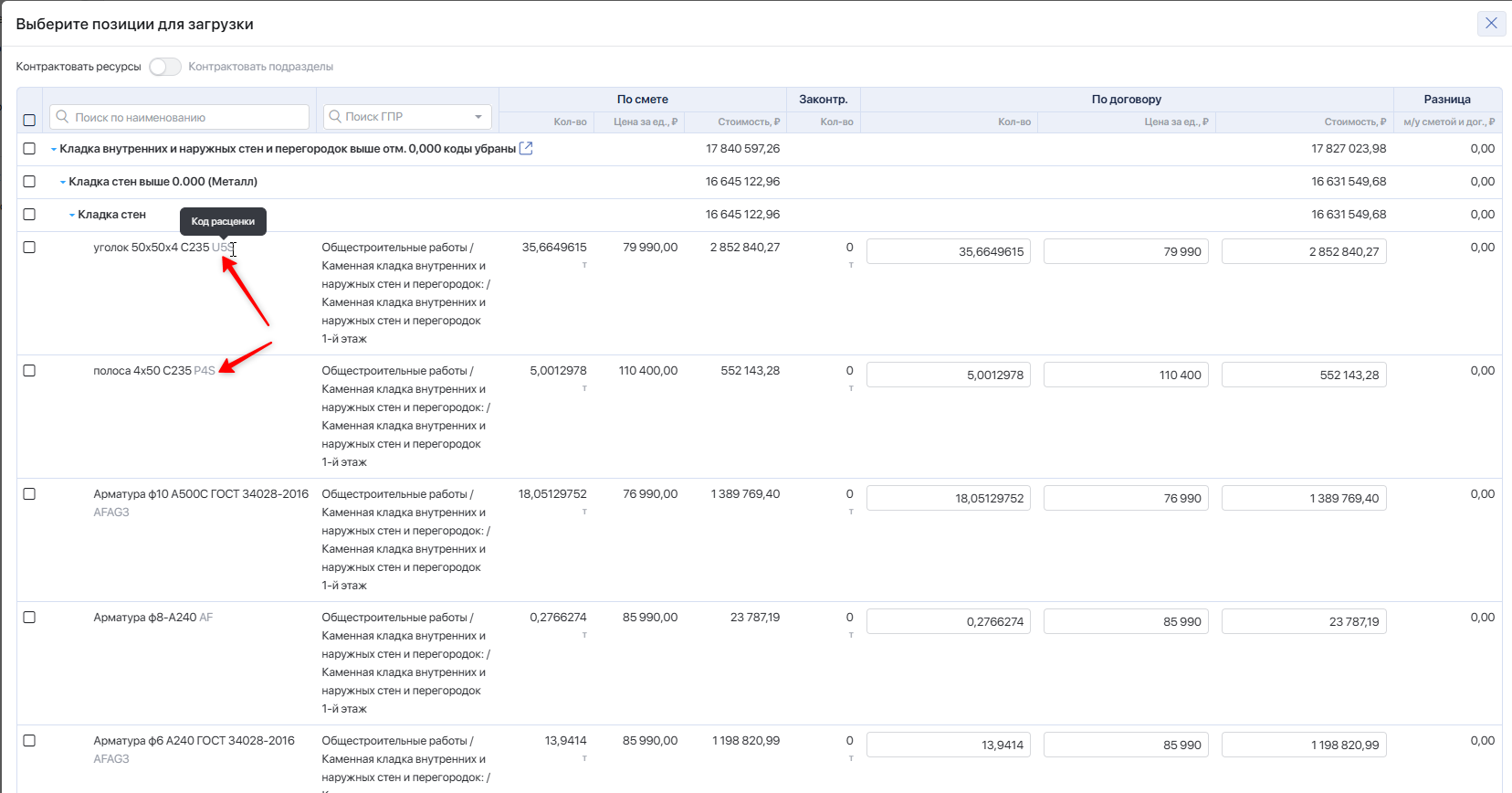 Код расценки из сметы — код, указанный в смете для конкретного ресурса. Если код отсутствует, значит он не указан ни в смете, ни в номенклатурном справочнике.