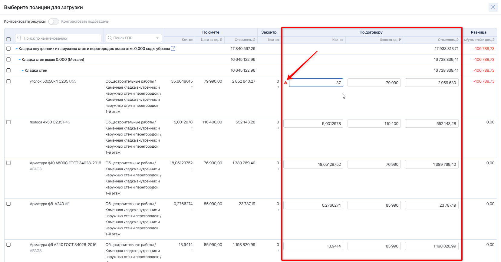 При превышении суммарного объёма позиции сметы по всем договорам система помечает строку красным значком с подсказкой, на какое количество идёт превышение объёма, указанного в смете, с учётом уже законтрактованных объёмов (включая текущий договор). Превышение рассчитывается как «объём позиции из сметы» минус «объём позиций из ранее созданных договоров» минус «объём позиции в данном договоре».