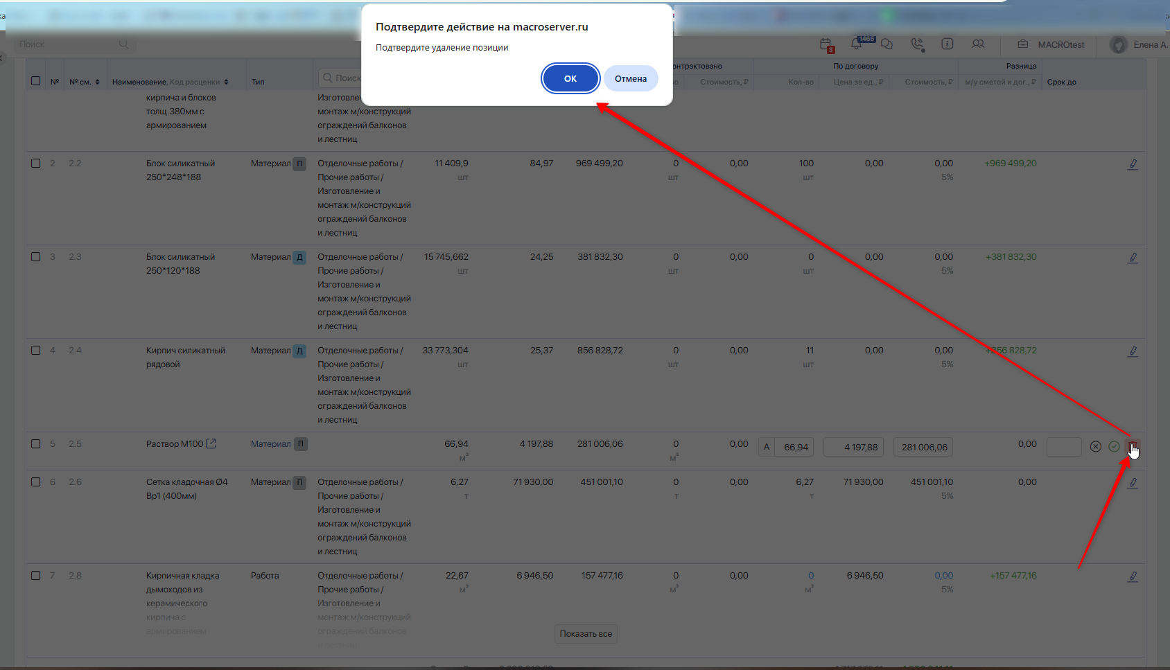 Чтобы удалить позицию из предмета договора, нажмите «Редактировать» (иконка «Карандаш») → «Удалить» (красный минус) → «ОК».