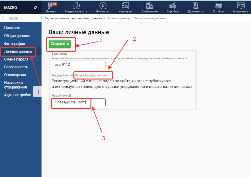 2. Текущий адрес электронной почты 3. Введите новый адрес электронной почты 4. Нажмите "Сохранить"