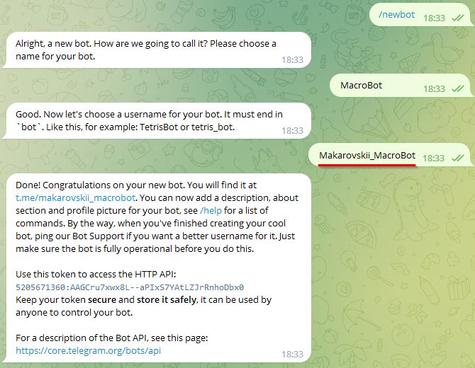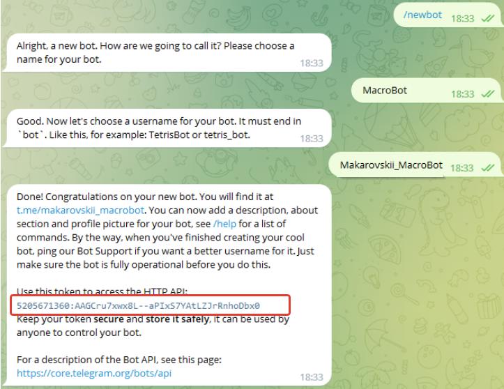 Введите имя для бота MacroBot и придумайте юзернейм бота, по которому его будут находить через поиск. Юзернейм должен быть в формате ClientName_MacroBot, пишем на латинице (например Makarovskii_MacroBot)