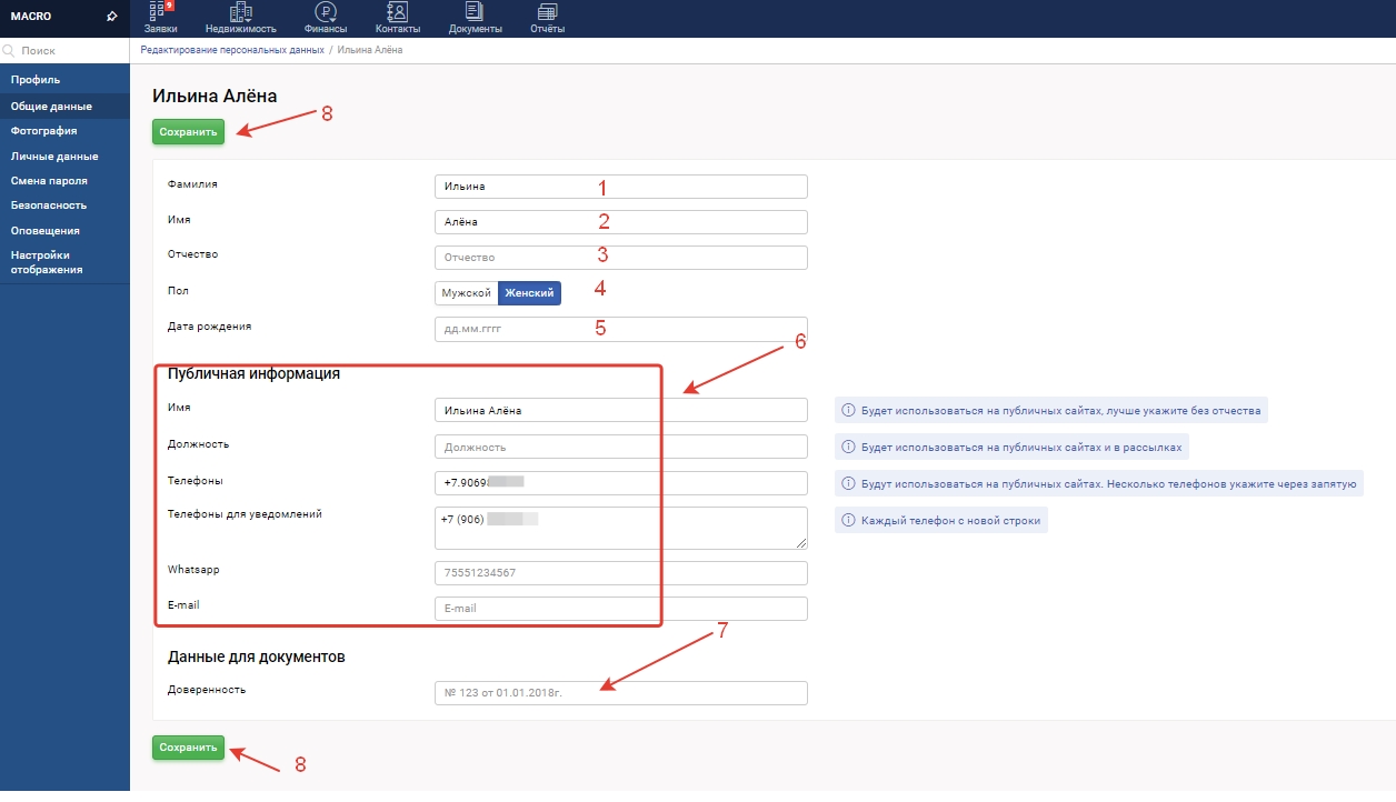 Фамилия 2. Имя 3. Отчество 4. Пол 5. Дата рождения 6. Информация, отображающаяся на публичных сайтах (Для CRM) 7. Информация для доверенности, используется в шаблонах договоров. (Для CRM) 8. Сохранение именений