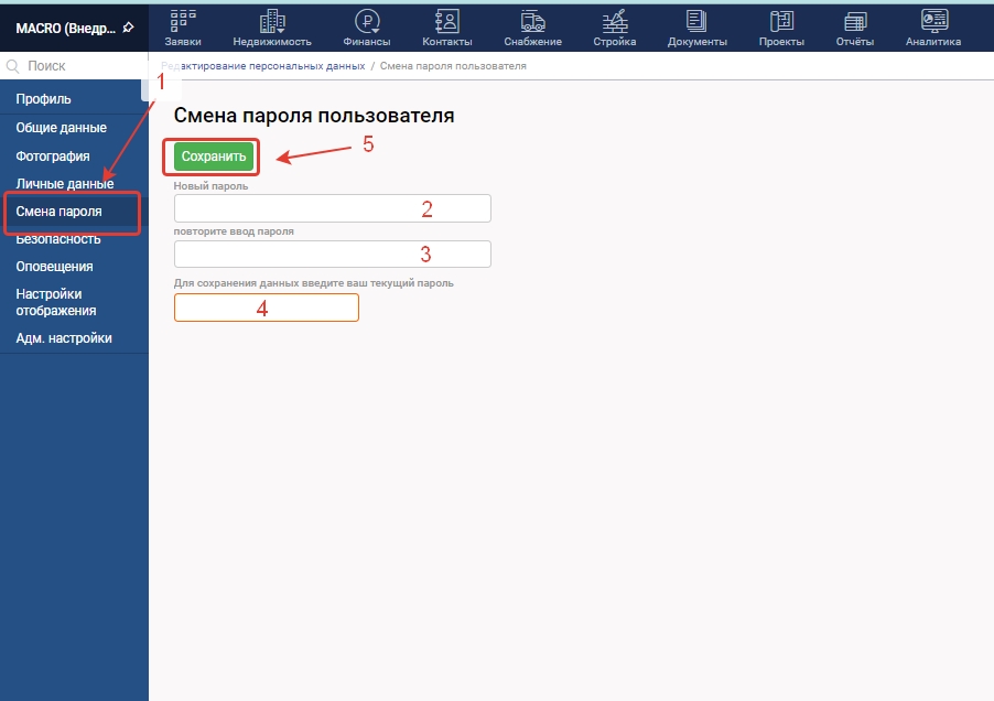 В меню слева выберите "Смена пароля" (1). В открывшемся окне введите новый пароль (2), повторите его (3), введите ваш текущий пароль(4). Нажмите "Сохранить" (5) Ваш пароль изменен и следующий вход вы осуществите с использованием нового пароля.