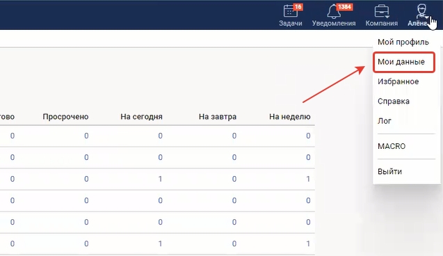 При необходимости изменить пароль, наведите курсор на свое имя в системе и из выпадающего списка выберете "Мои данные"