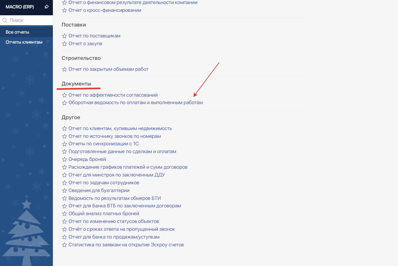 Выберите отчет "Оборотная ведомость по оплатам и актам выполненных работ" в разделе Документы