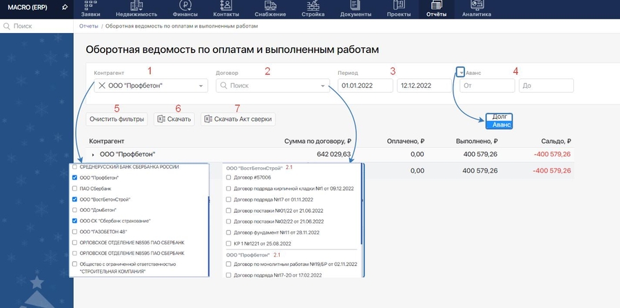 4. Аванс/Долг - цифровой диапазон по сумме. Фильтрация идет по столбцу Сальдо.