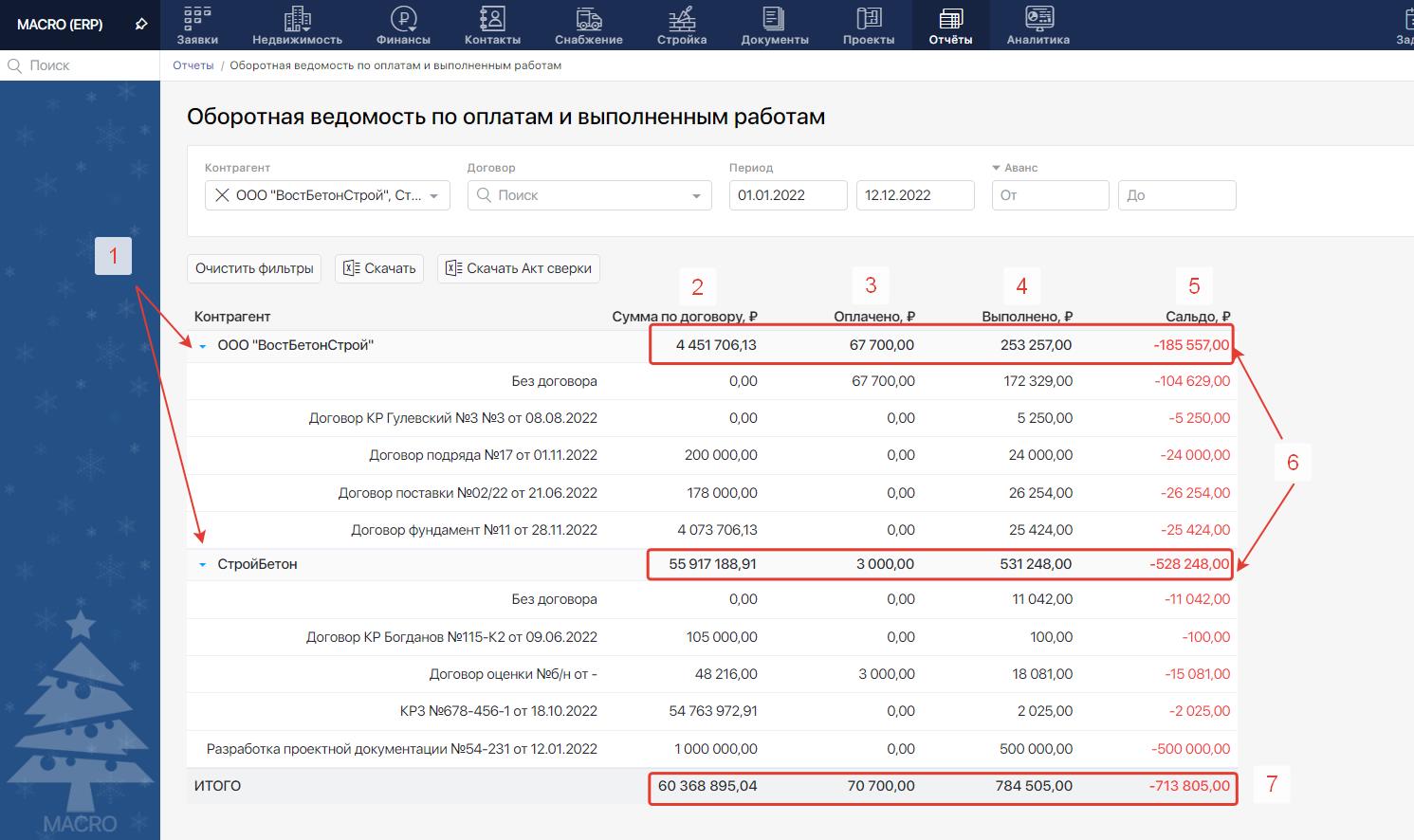 5. Сальдо - Разница между Оплачено и Выполнено (Сальдо = Оплачено - Выполнено)