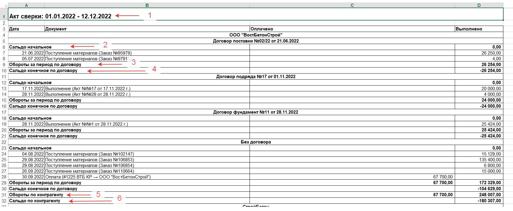 4. Выполнено - сумма всех согласованных актов выполненных работ в разрезе контрагента и/или стоимость доставленных на склад материалов по заказам, где договор указан как договор поставки или контрагент указан как поставщик (кроме возвратов материалов на склад от подрядчика)