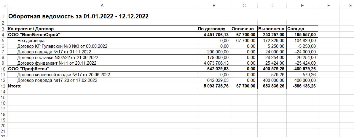 Группировка данных идет по Контрагенту, внутри контрагента по Договору (и "Без договора", если такие есть), внутри договора "Сальдо начальное", "Обороты за период по договору", "Сальдо конечное по договору"